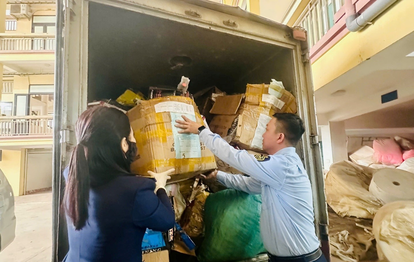 Hàng hóa được vận chuyển ra xe của Công ty Môi trường để vận chuyển đến nơi tiêu hủy